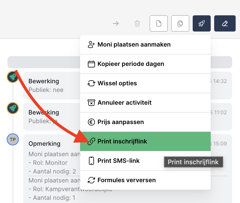 Bij de activiteit kan je ook de actie 'Print inschrijflink' gebruiken om deze automatisch te generen.